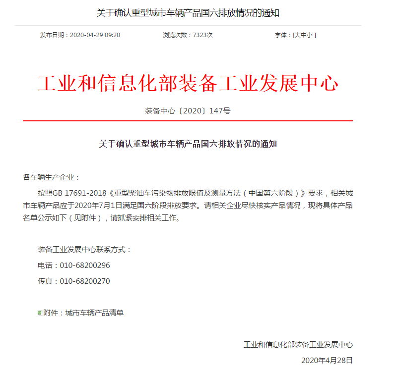 按照GB 17691-2018《重型柴油車污染物排放限值及測(cè)量方法(中國(guó)第六階段)》要求,相關(guān)城市車輛產(chǎn)品應(yīng)于2020年7月1日滿足國(guó)六階段排放要求。請(qǐng)相關(guān)企業(yè)盡快核實(shí)產(chǎn)品情況,現(xiàn)將具體產(chǎn)品名單公示如下(見附件),請(qǐng)抓緊安排相關(guān)工作。