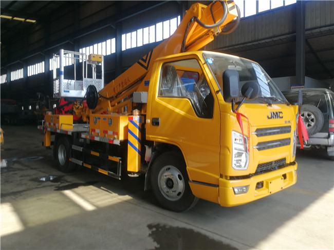上裝配置:液壓360度全回轉,三節折疊臂,單液壓舉升缸,帶雙向平衡閥,電控操作舉升臂,1噸可伸縮式吊鉤,四支液壓油缸可調式支腿帶雙向液壓鎖(支腿操作為手動操作,可單獨控制)。左右警示燈,黃色車身,全車貼反光標識,雙人穩定作業斗,帶后防護,倆側防護,配一個移動工具箱。